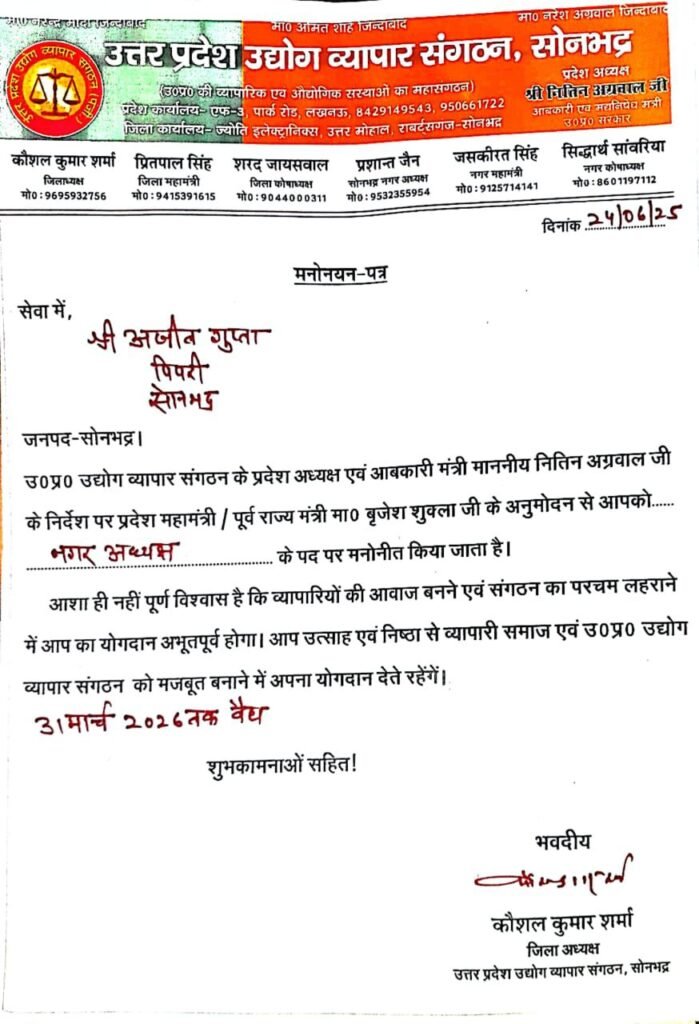 सोनभद्र-: पिपरी के अजीत गुप्ता बने नगर अध्यक्ष तो ओमप्रकाश दुबे बने नगर महामंत्री