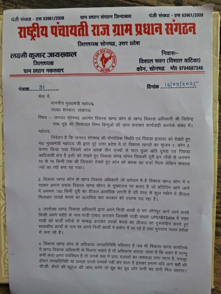 राष्ट्रीय पंचायती राज ग्राम प्रधान संगठन के जिला अध्यक्ष सोनभद्र लक्ष्मी कुमार जायसवाल ने मुख्यमंत्री को लिखा पत्र
