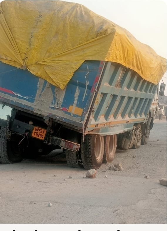 सोनभद्र-: हाईवा की टूटी कमानी, बखरिहवां बीजपुर मार्ग पर लगा जाम राहगीर परेशान
