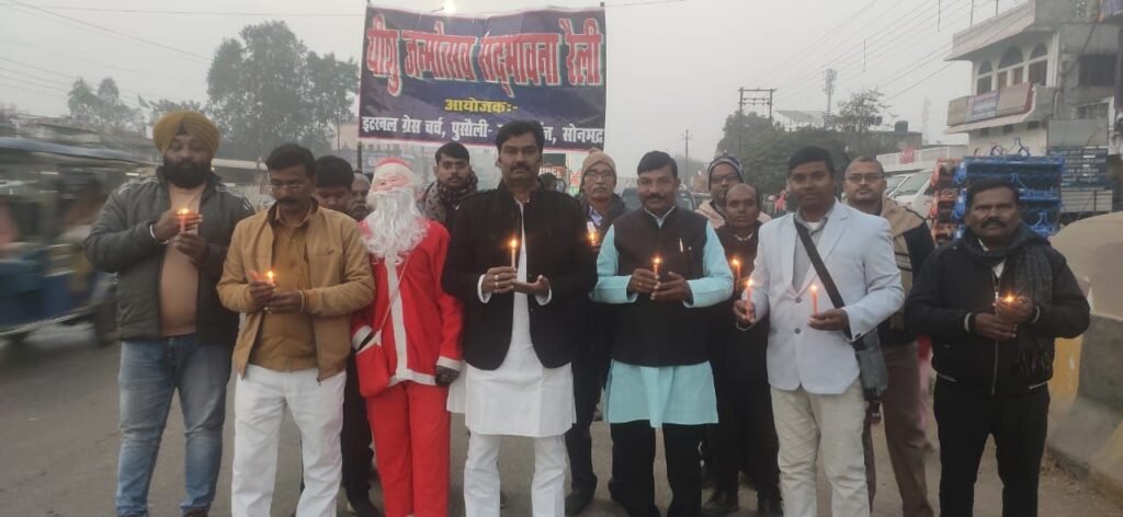सोनभद्र। जनपद में विगत वर्षों की इस वर्ष भी प्रभु यीशु मसीह के पावन जन्मोत्सव के शुभ अवसर पर पुसौली स्थित इटरनल ग्रेस चर्च द्वारा 24 दिसंबर 2025 को यीशु जन्मोत्सव सद्भावना रैली का आयोजन किया गया। रैली का उद्देश्य समाज में प्रेम, एकता और सद्भावना का संदेश फैलाना है।