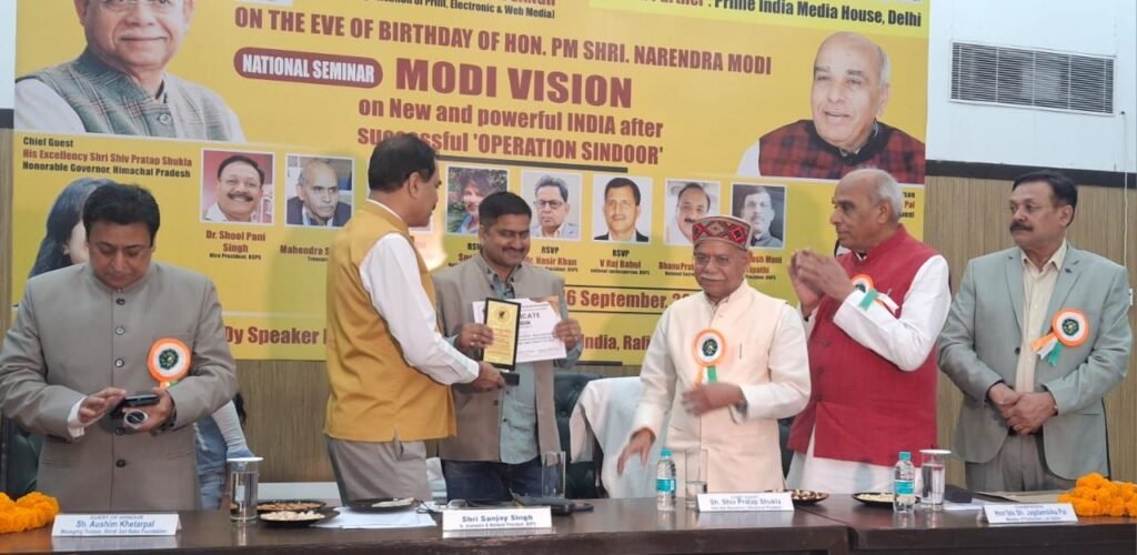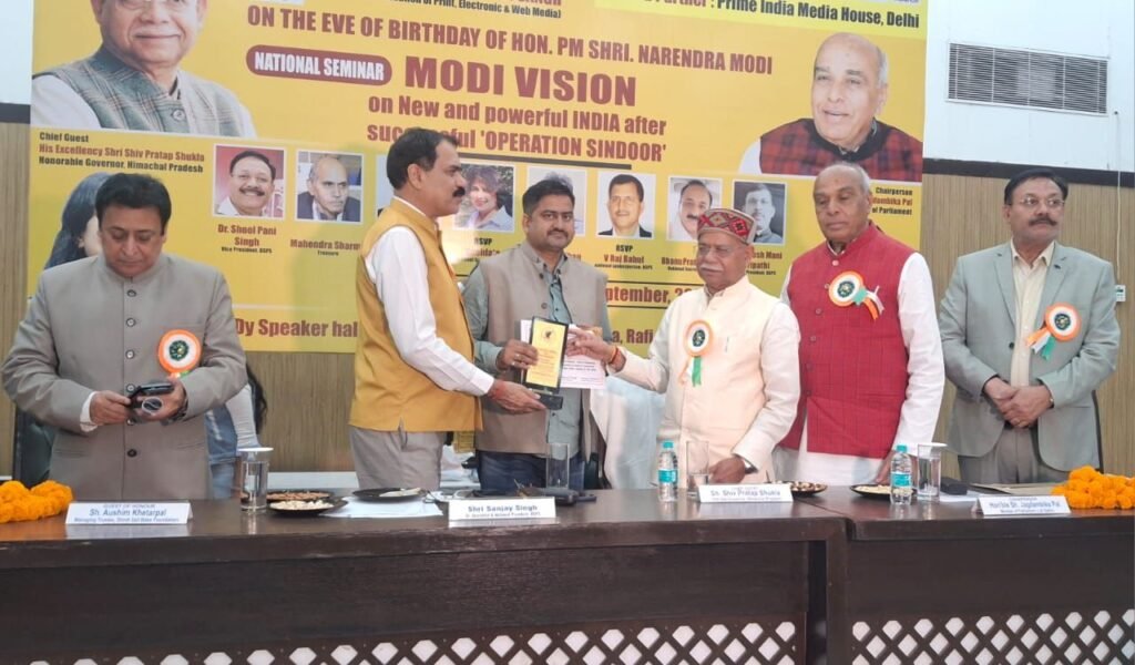 सोनभद्र। भारतीय श्रमजीवी पत्रकार संघ मीडिया पार्टनर प्राइम इंडिया मीडिया हाउस, दिल्ली में प्रधानमंत्री नरेन्द्र मोदी के जन्मदिन की संध्या पर राष्ट्रीय संगोष्ठी मोदी विजन सफल ‘ऑपरेशन सिंदूर’ के बाद नया और शक्तिशाली भारत के मुद्दे पर कार्यक्रम स्थल उप सभापति हॉल एनेक्सी, कॉन्स्टिट्यूशन क्लब ऑफ इंडिया, रफी मार्ग, नई दिल्ली में हुआ सम्पन्न।