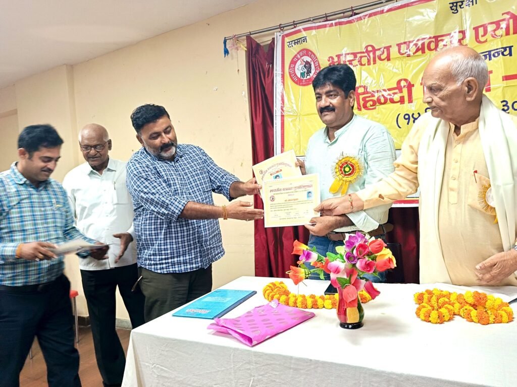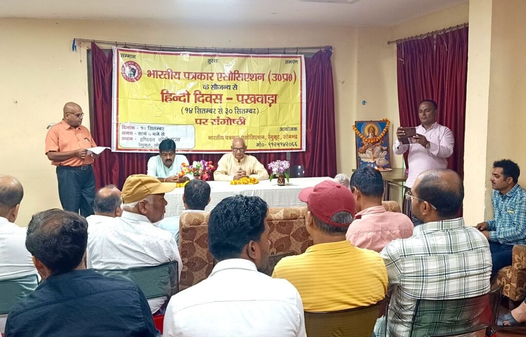 रेणुकूट। नगर में भारतीय पत्रकार एसोसिएशन के तत्वावधान में रविवार की शाम एक निजी होटल में हिंदी दिवस पर भव्य गोष्ठी का आयोजन किया गया। कार्यक्रम में मुख्य अतिथि के रूप में राजकीय इंटर कॉलेज पिपरी के हिंदी के पूर्व प्रवक्ता राजनारायण मिश्र उपस्थित रहे, जबकि इसकी अध्यक्षता संगठन के प्रदेश सचिव अनिल द्विवेदी ने कीl मुख्य अतिथि राजनारायण मिश्र ने अपने संबोधन में कहा, “हिंदी केवल हमारी भाषा नहीं, बल्कि हमारी सांस्कृतिक पहचान और एकता की डोर है। आज के बदलते परिवेश में हिंदी का प्रचार-प्रसार और भी आवश्यक हो गया है। हमें गर्व होना चाहिए कि हिंदी विश्व की सबसे समृद्ध भाषाओं में से एक है और इसे विश्व स्तर पर सम्मान मिल रहा है।”