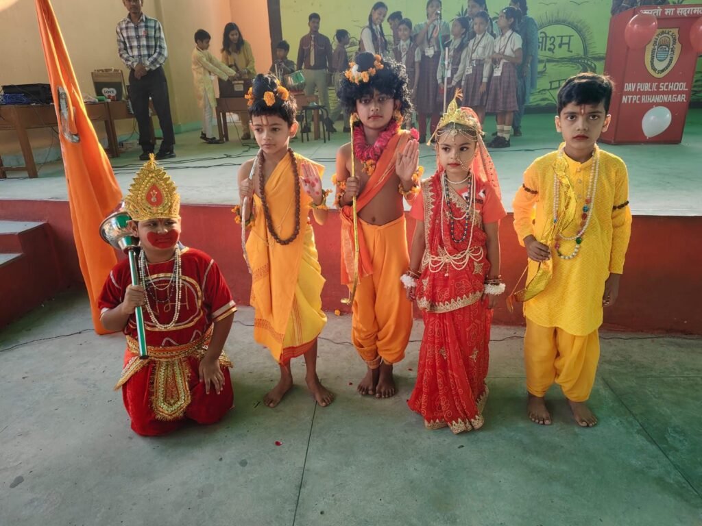 तत्पश्चात धनतेरस के शुभ अवसर पर फैन्सी ड्रेस, डांस, रंगोली , दीया निर्माण के साथ धार्मिक संगीत का भव्य आयोजन किया गया। विद्यालय के नन्हें मुन्ने बच्चे रामचन्द्र जी, सीता जी, हनुमान जी तथा उनकी सेना की वेशभूषा में अत्यंत मनोहारी दिखाई दे रहे थे। समर मोदनवाल- राम ,स्मृति यादव – सीता, अर्पित पाठक- लक्ष्मण, श्रेयांस उपाध्याय- हनुमान जी तो रौनक चौरसिया- रावण के वेश में सबको आश्चर्यचकित कर रहे थे। उसके बाद विद्यालय में हवन किया गया। यजमान की भूमिका में अभिभावक प्रतिनिधि हरिओम मिश्रा एवं रसायन विभाग के वरिष्ठ शिक्षक वी के तिवारी रहे। हिंदी शिक्षिका समता सिंह, रंजना सिंह, अनामिका त्रिपाठी, सोनी कुमारी, शगुफ्ता शबनम आदि ने वैदिक मंत्रोच्चार से पूरे वातावरण को भक्तिमय बना दिया। तत्पश्चात एनटीपीसी से पधारे हरिओम मिश्रा एवं संदीप जोशी ने रंगोली प्रतियोगिता में कक्षा छठी से आठवीं तक के बच्चों में दयानंद सदन को प्रथम, अरविन्द सदन को द्वितीय तथा विवेकानन्द को सदन तृतीय एवं कक्षा नौवीं से बारहवीं तक के बच्चों में श्रद्धानंद सदन को प्रथम, विवेकानंद सदन को द्वितीय तो दयानंद सदन को तृतीय स्थान दिया। रंगोली प्रतियोगिता में सारिका, प्रणिता, दिव्यांका, शैलजा, समृद्धि, अंकिता, अद्विता,
