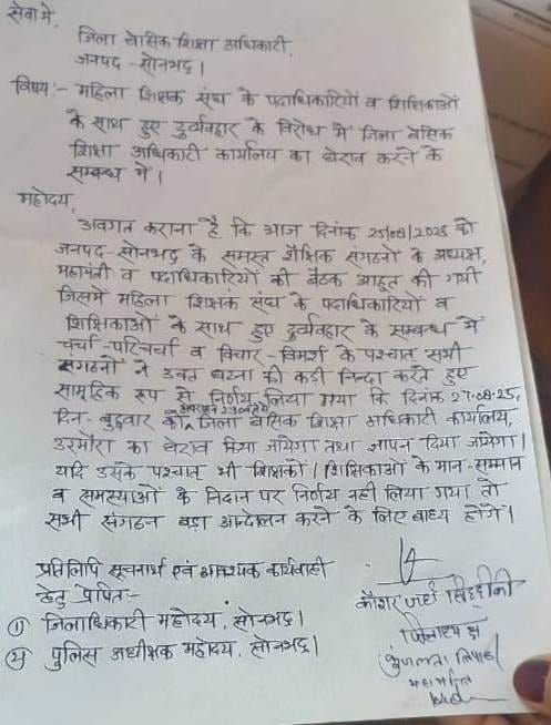 सोनभद्र। महिला शिक्षिकाओं के साथ बीएसए एवं संविदाकर्मी डीसी द्वारा हुए दुर्व्यवहार को लेकर जिले के शिक्षक संगठनों में नाराज़गी बढ़ गई है। दुर्व्यवहार के वायरल वीडियो के बाद न केवल जिले अपितु प्रदेश के सभी शिक्षकों में आक्रोश व्याप्त है।
